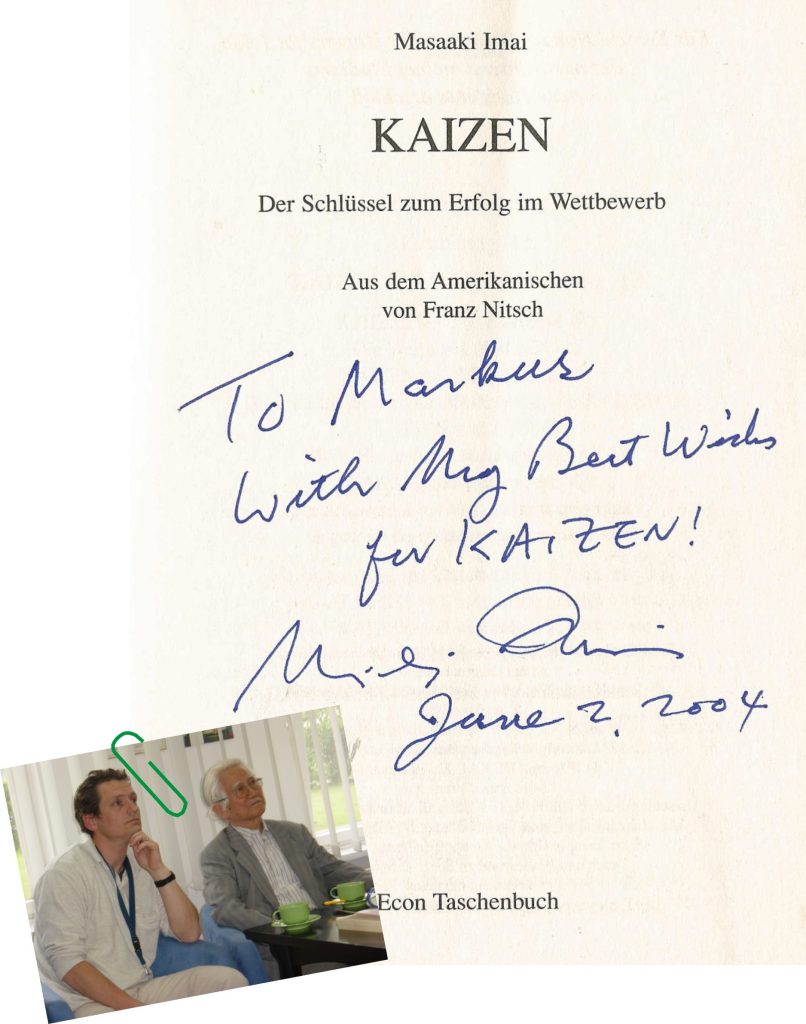 … begann 2004 mit der Lecture des Buches „KAIZEN” von Mazaaki Imai, dem Kaizen GURU schlechthin. Mit der daraus gewonnenen Begeisterung, konnte ich glücklicherweise sehr schnell, die ab dann brennende Flamme in mir, auf das Topmanagement übertragen. Das Projekt Kaizen begann im Unternehmen, und ich begann in der deutschen Niederlassung der Kaizen Institute in 2004 die Ausbildung zu den Bazics«. Aus den Flammen wurde ein Brand, den ich 2005 mit der Qualifikation zum KAIZEN COACH «« erfolgreich abschlieβen konnte. Die logische Folgerung, war dann die Weiterbildung auf die zu der Zeit höchsten Stufe, der Qualifikation zum Kaizen Manager