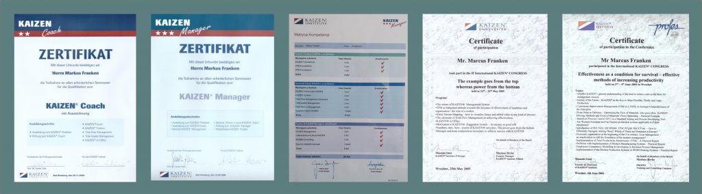 In meiner Zeit als Produktions- und Changemanager beim gröβten belgischen Polstermöbelhersteller, konnte ich das gewonnene Wissen aktiv in Projekten, mit den mir anvertrauten Menschen umsetzen. Die Tätigkeiten beinhalteten sowohl Total-Quality-Management, Total-Flow-Managemnet, Just-In-Time Produktionen, als auch die Prozessindutrialisierung der bis dahin allgemein eher handwerklich organisierten Prozesse. Es war zu dieser Zeit das erste Projekt, welches „Kaizen Institute” in Polen betreute, was zur Folge hatte dass ich in mehreren Audits die Ehre und das Vergnügen hatte durch Herrn Masaaki Imai persönlich auditiert zu werden. Ich möchte an dieser Stelle groβen Dank an meinen Kaizen Mentor Carsten Otto, sowie Herrn Masaaki ausdrücken.